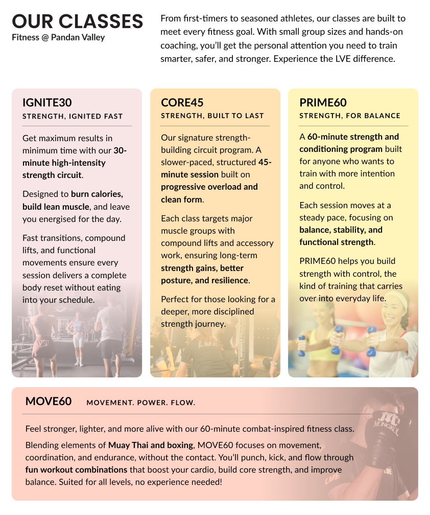 Choose from a 30-min / 45-min / 60-min class, led by experienced fitness trainers to achieve your body and fitness goals.